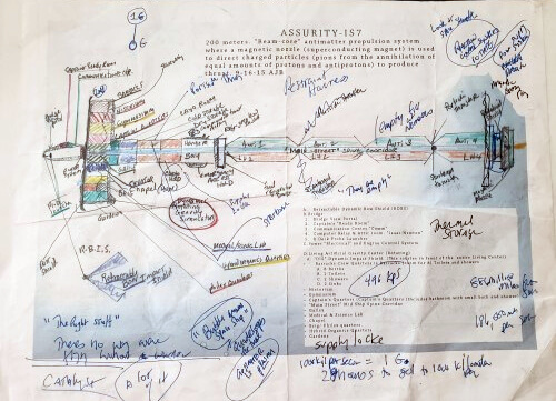 I began designing the ship for my space novel Assurity-A Space Thriller early on. My space and science associate Jim Bickford, a true professional space scientist assisted me with functionality for both the antimatter drive and the proper ship layout. (As well as many, many other aspects of the novel.) As a sci-fi space writer you must understand your space vehicles and how the crew functions within each if you are going to portray the setting with conviction.